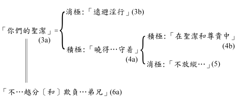 这里用的是跟三章十三节不同的名词“圣洁”,这字41在新约共享了十次:两次指圣灵把人分别出来使之归于基督的行动(帖后二13;彼前一12),其余八次都是指“成圣”的过程或其果效(本节、4节、7节;罗六19、22;林前一30;提前二15;来十二14)。这就是说,信徒除了藉着圣灵的工作(帖后二13;彼前一2;参罗十五16)、因信(帖后二13)、在基督里(林前一2)在地位上成为圣洁(林前六11)之后,必须进而经历在实际的生活行为上“成为圣洁”的过程。“你们的圣洁”可解为“你们(被神使你们)成为圣洁”,或“你们叫自己成为圣洁”,鉴于下文的重点是在信徒当做的事,后者较适合本段的文意;不过我们要同时强调,保罗绝对不认为信徒可以靠自己的力量成为圣洁,因此,“使自己成圣”的重点只是在信徒本身有责任,需要采取主动去使自己成为圣洁,却绝不等于“靠自己成圣”;42事实上,在信徒采取主动的背后先有神的主动(腓二13),他们在“使自己成圣”的过程中,必须倚赖神的工作(帖前五23)以及圣灵的引导和能力(加五16、18、25b;罗八13、14)。“成为圣洁”本身的意思非常广泛(参三13“圣洁”一词的注释),不过在本段,它的意思显然是和“淫行”、“私欲的邪情”及“污秽”(3b、5、7节)相对,因此其重点是较狭窄地局限于“清洁”之意。保罗在下文(3-6节在原文是一句)以四个不限定格的词引介的话阐释“成为圣洁”所涉及的内容。43