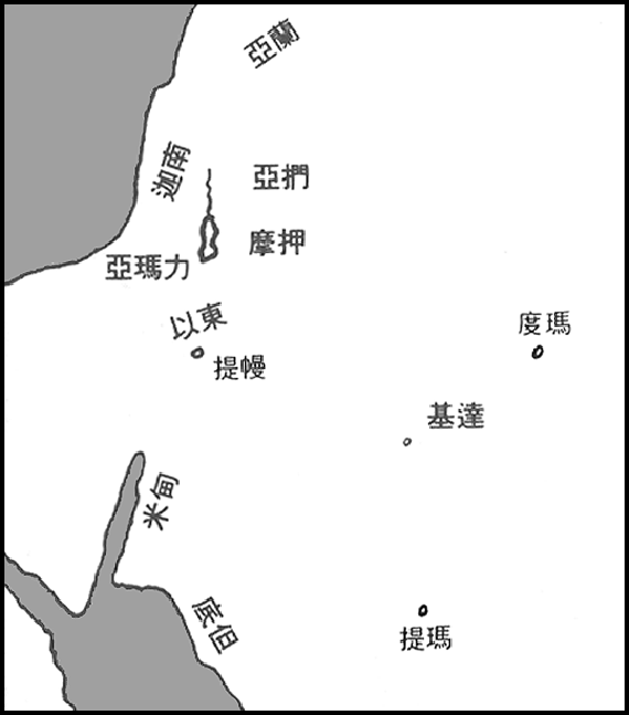 我在上图粗略地绘出,与这些不同民族有关的在巴勒斯坦邻近的位置。显然由地理与种族观点看来,迦南人应当在他们当中;但是要记得,由于希伯来人的成见,他们在第九章和第十章却被列为含族或非洲人。这应当提醒我们,在这些名单中所保存的数据,不只有价值而且有时也有偏见的。(参看九20-29──关于希伯来民族表的思想的注释。)