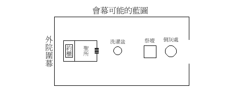会幕 会幕( ~ohel mo'ed)自先是在出廿七21提说,这是神与以色列人相会的地方。中文翻译这个神与以色列人相会的地方有点混乱。会幕多时与帐幕通用,正如出卅九32说:“会幕,就是帐幕”。35然而意思并不明朗,因为中文圣经的帐幕包括了两个不同希伯来文的翻译:(1) mishkan从动词 shakan居住36引申出来,在与会幕有关的经文外,主要中文翻译是居所,这字表露神吩咐以色列人造会幕的目的:“当为我造圣所,使我可以住( shakan)在他们中间,制造帐幕( mishkan)和其中的一切器具,都要照我所指示你的样式。”(出廿五8-9)所以这字基本意义是指出会幕的用途,是作为神居住人间的象征,而没有建筑物类型的含意,因此除了五经外,其他经节都将 mishkan翻译作神的居所(代下廿九6;诗四十三3,四十六4,七十四7,八十四1,一三二5、7;结卅七27等)。(2) ohel,是旧约以色列人作为居住用途的帐棚,这字界定住所种类是用布幕制造,既然神的居所建筑材料是用布帐为墙, ohel可以是指会幕的布幔,中文翻译为罩棚,也可以指整个神的居所,就翻译为帐幕37(这就与 mishkan混乱和会幕38(这与 ~ohel mo'ed混乱。