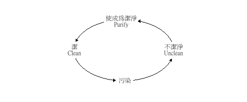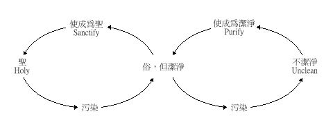 圣洁在希伯来文只是一个“圣”的观念。中文却已经把“洁”的观念也包括在内了。“圣”( q-d-sh 的原意是分别出来归给神。62在亚甲文的意思是使洁净、纯净、和奉献出来的,而乌加列文的基本意思是“圣”,含有宗教的色彩。63“圣”和“洁”其实有密切的关系,“洁”的原文是 t-h-r,它的意思是由不洁( t-m-')当中出来,就是洁净的。“圣”的意思是由俗的当中分别出来归给神,所以说,圣洁有不可分割的关系。凡是归给神的,都应该是“洁”的,但“洁”的若不归给神它是俗的,不是圣的。温恒用了这样的图表去表达它们之间的关系:64