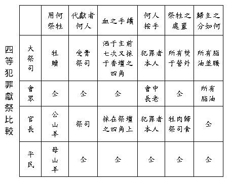 受膏祭司所献之赎罪祭,其祭牲及手续,比较官长及平民,甚有分别,看表可详知。如洒血之工,须到主前弹七次,又要抹于香坛之角,(六,七节)此可见祭司犯罪在主前视为甚大之事,与主之圣义有何关系,故要带血入到圣所,在主前弹七次,(七次意即完全)又要抹血于香坛之角上,此表求赦之意。我们为心灵界领袖之人,即牧师传道等,犯了一件人所视为普通寻常之罪,或人不以为罪之罪,而心内常受甚重之警责,有时虽已悔改,然觉尚有余痛,何故?此即弹之工未至七次,又未作抹血香坛角上之工也;较之平民犯罪,他们不过在祭坛四角上抹血,即可了事,(卅五,卅节)大不同也。何以 神特别严待祭司较他人为重?在十章七节有云“因为耶和华的膏油在你们的身上,”既如此,则必受鞫更严;(雅三章一节)且因“受膏祭司犯罪,使百姓陷在罪里,”(三节)所以有此严重之赎罪手续。我们由此则知地上之祭司,尚有如此软弱,故圣经屡言祭司先为己献,后为民献;但我们在天之大祭司,耶稣基督,根本无罪,亦不为献赎罪祭,只有常常举手为其民代祷而已。