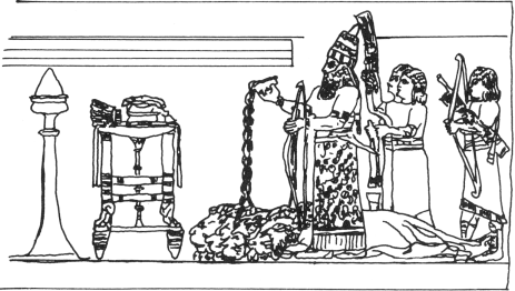 亚述巴尼帕的武功是惊人的,他不但统治了将近四十年(668631 B.C.),而且他的版图也从底格里斯河到尼罗河。他不单是骑术高明,射箭百发百中,他对艺术的提倡也不遗余力。若不是那些国王在艺术上的提倡,我们不可能有那么多的资料供后人的研究。附图的亚述巴尼帕在狮子身上的奠酒作为献祭与神明的一种仪式,使我们既可以看到当时的仪式,又可以欣赏当时的艺术作品。(图十三)