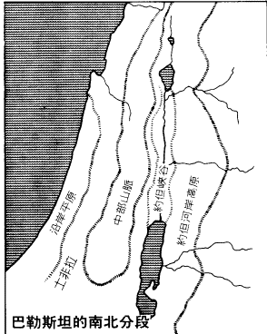 南北分段。政治性疆界会因时而易,但地理环境却千古难变。巴勒斯坦是近东土地形成过程的的一部份,这里地壳变动所产生的土地,沿着地中海及爱琴海绵延数百哩。巴里(D.Bala)肯定地表示,这里的地形结构,主要是由东北向西南伸展,因此地中海一带,差不多每一处地点,都有一个相同的地形规律,就是由西向东排列了五个明显的特征:沿岸是平原,西部是山脉(巴勒斯坦的山脉则是在中部),或隙缝似的山谷系统,东部是山脉或高原,然后就是沙漠。