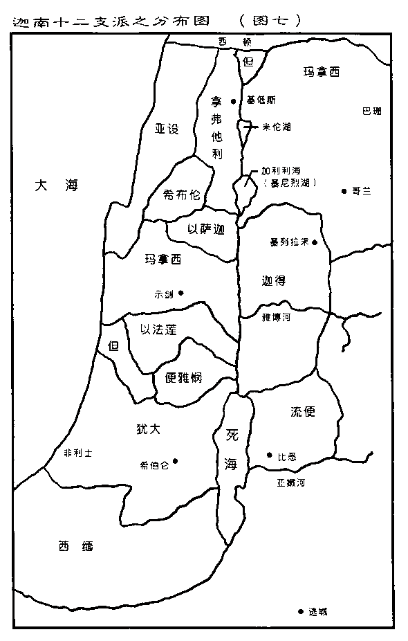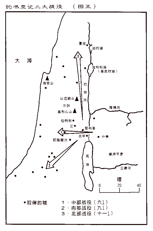 迦南中部虽然已落在以色列人的手里,但是南部和北部仍有不少敌人,在以后的日子里,约书亚南征北讨,击败了迦南众王,又攻败了许多重要的城市,这些成果足够让以色列民在迦南定居下来。约书亚把整个迦南地分给九个支派为业,这九个支派包括约瑟两个儿子以法莲和玛拿西的后代,而利未支派就被分别出来,专司祭祀的职事,仰望神的供给,没有分地为业(书十四3:民十八20~28)。