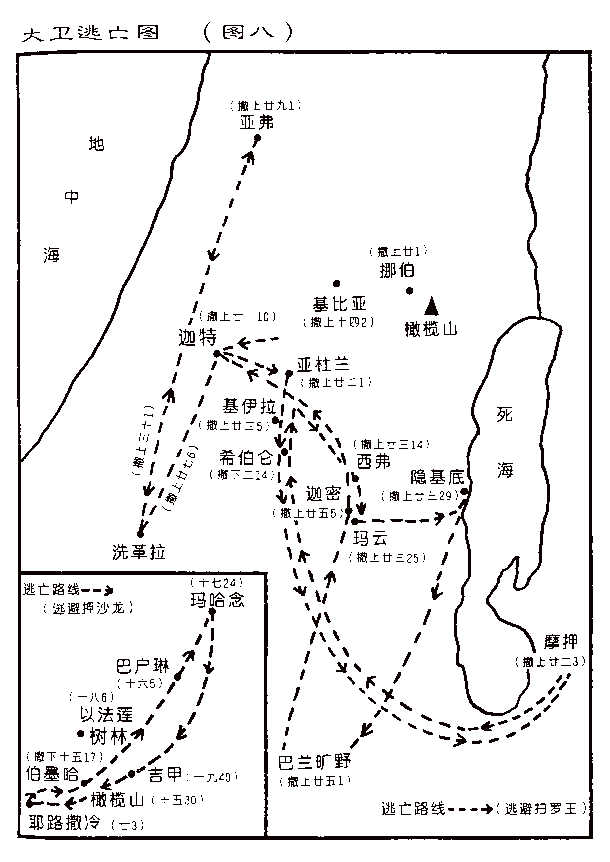 大卫在经历四处飘泊流亡之中,逐渐赢得一群跟从者,有四百人之众,后来又增加到六百人,俨然成了一支军队。在扫罗追赶大卫途中,大卫曾有两次杀他的机会,但大卫敬畏耶和华,不敢杀害耶和华的受膏者,两次大卫都放过了他(撒上廿四,廿六)。可惜扫罗精神错乱了,他不知好歹,时常反悔,大卫被逼得无路可逃,只好逃到非利士地,投奔迦特王亚吉,并得到「洗革拉城」,作为军事基地。