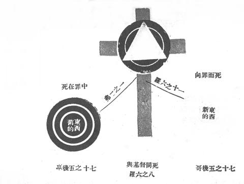 这图左方的圆形是表明人罪的情况,十字架上的金色三角形是表明基督乃荣光的主,是神的儿子,他离天上的荣位降生成为人,负世人的罪钉上十字架,所以金色三角形外的黑圆形,是基督因我侪而成为罪人的意思。基督本无罪,但他因是救主,要担罪人的罪,世人所有的罪都尽负之于十字架,所以圣经明言他无罪而成为有罪,他负罪在十字架时,甚至父神也离了他。